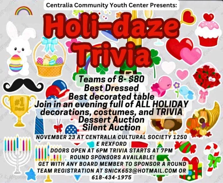 The Centralia Cultural Society, in connection with the Centralia Community Youth Center, will present the Holi-daze Trivia event on Saturday, Nov. 23 at the CCS.