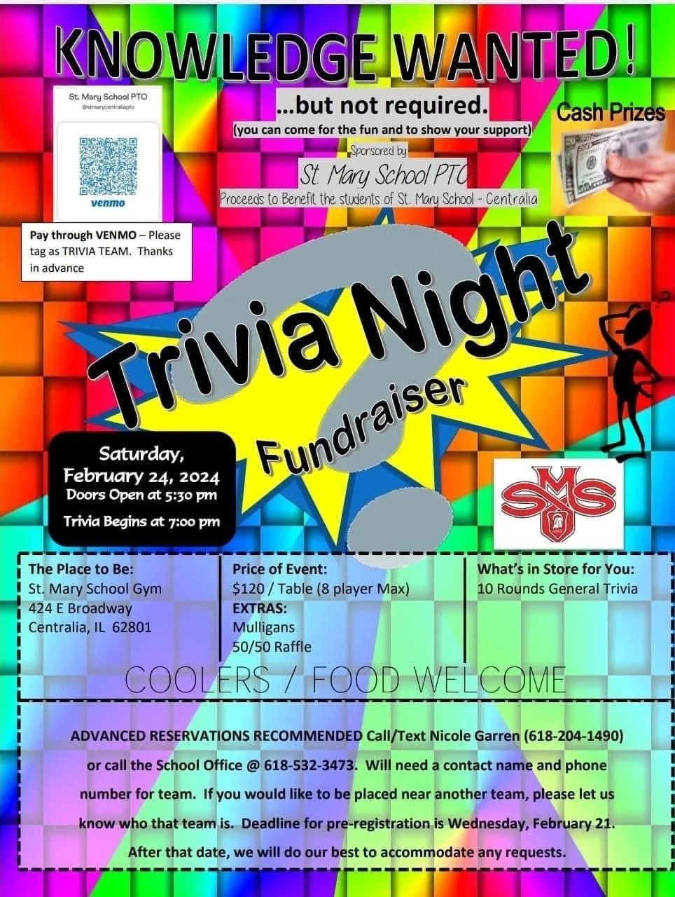 St. Mary School Centralia PTO is hosting their annual Trivia Night to benefit their students on Saturday, February 24th. Doors open at 5:30pm. Trivia starts at 7:00pm.