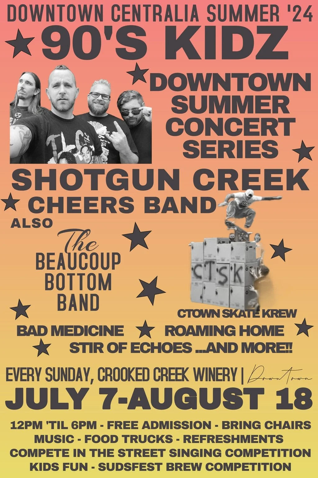 Grab your lawn chairs and come Downtown Centralia for live music, food trucks, refreshments, and more! Crooked Creek Winery Downtown is hosting Downtown Summer Concert Series again this year! Every Sunday from 12:00pm to 6:00pm, July 7-August 18. See you there!