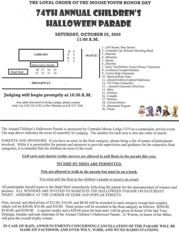 74th Annual Children’s Halloween Parade Saturday, October 25, 2025 11:00 AM 12:00 PM Centralia Regional Library East Broadway Centralia, IL 62801 (map) Google Calendar ICS