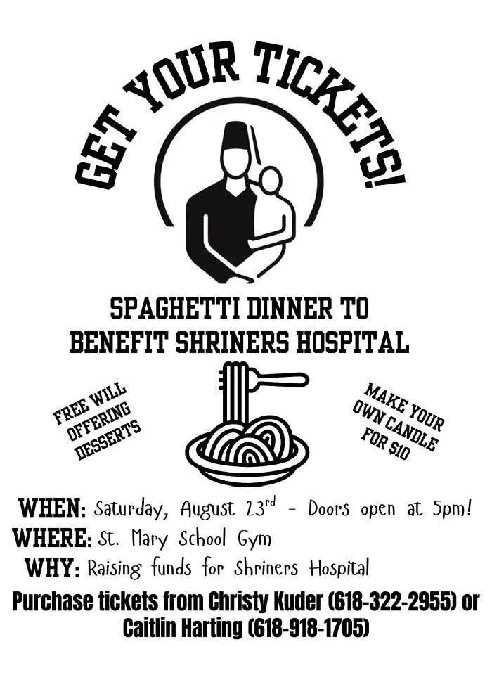 Back to All Events Spaghetti Dinner to Benefit Shriner's Hospital Saturday, August 23, 2025 5:00 PM 7:00 PM St. Mary School (Gymnasium) 100 North Maple Street Centralia, IL, 62801 United States (map) Google Calendar ICS