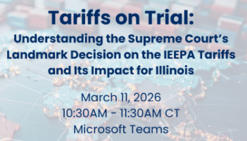 Join us for “Tariffs on Trial: Understanding the Supreme Court’s Landmark Decision on the IEEPA Tariffs and Its Impact for Illinois Businesses.” This timely webinar will break down what the ruling means, why it matters, and how businesses across Illinois can prepare for the regulatory and economic shifts ahead. Whether you’re a business owner, policy professional, or industry stakeholder, this session will offer practical insights to help you navigate the changing landscape.