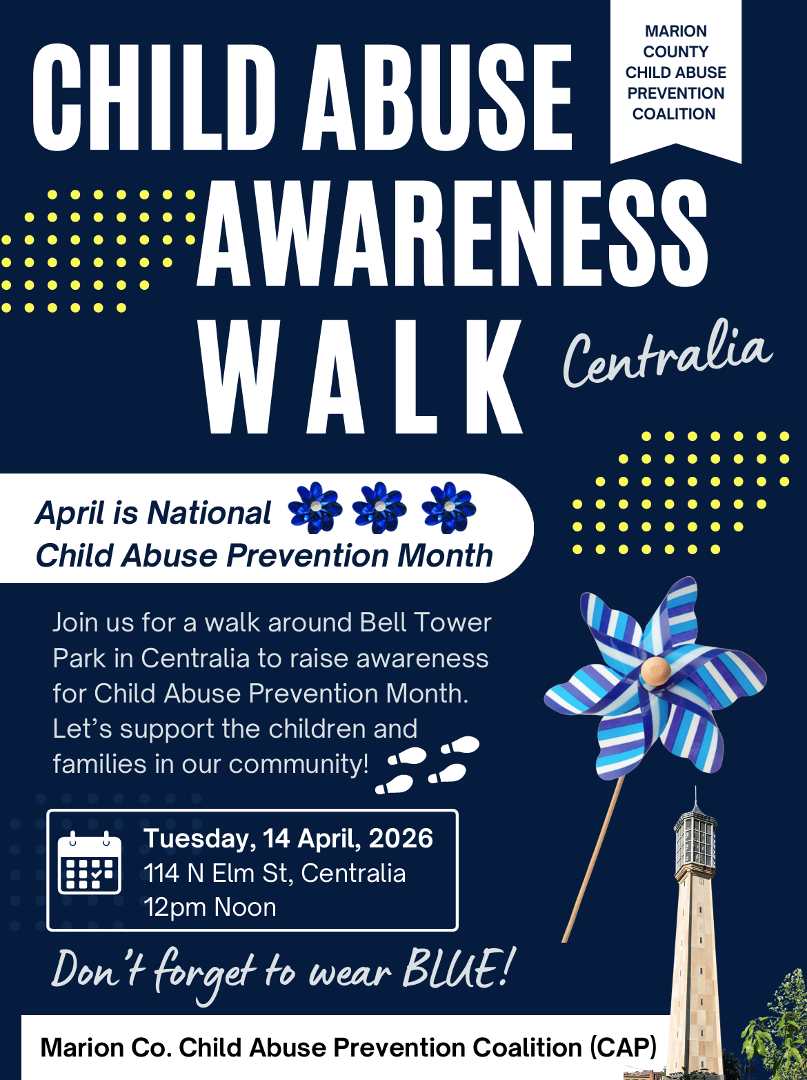 Back to All Events Child Abuse Prevention Walk Tuesday, April 14, 2026 12:00 PM 1:00 PM Centralia Carillon Centralia, IL 62801 (map) Google Calendar ICS