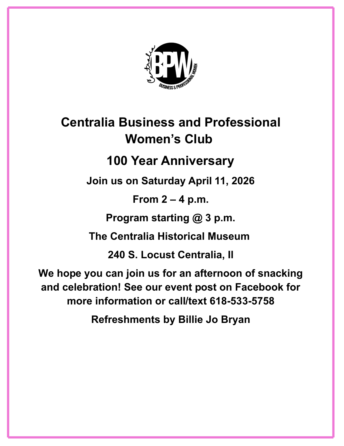 Centralia BPW will be holding an event to celebrate our 100th Anniversary on Saturday, April 11th, from 2 to 4 pm at the Centralia Historical Museum. We will start a short program at 3 pm that highlighting our history and membership. We will have refreshments to enjoy while looking through BPW artifacts on display.