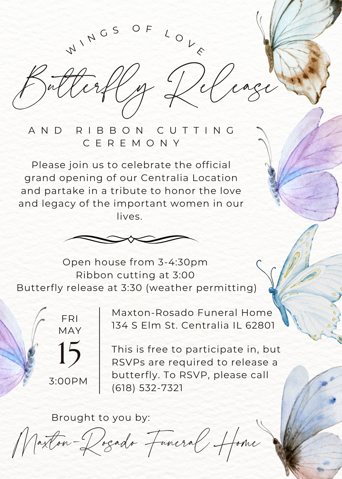 Back to All Events Ribbon Cutting and Butterfly Release at Maxton Rosado Funeral Home Friday, May 15, 2026 3:00 PM 4:30 PM Maxton-Rosado Funeral Home 134 South Elm Street Centralia, IL, 62801 United States (map) Google Calendar ICS