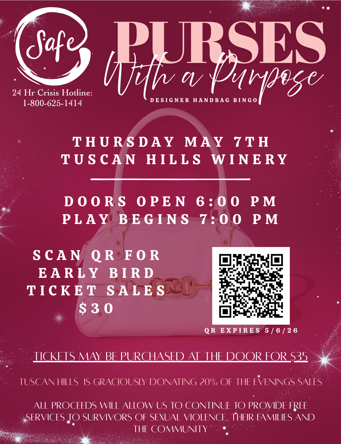 Enjoy an exciting night of bingo while playing for beautiful designer handbags—all while supporting Safe’s mission to provide free and confidential advocacy, counseling, and prevention education services to survivors of sexual violence.