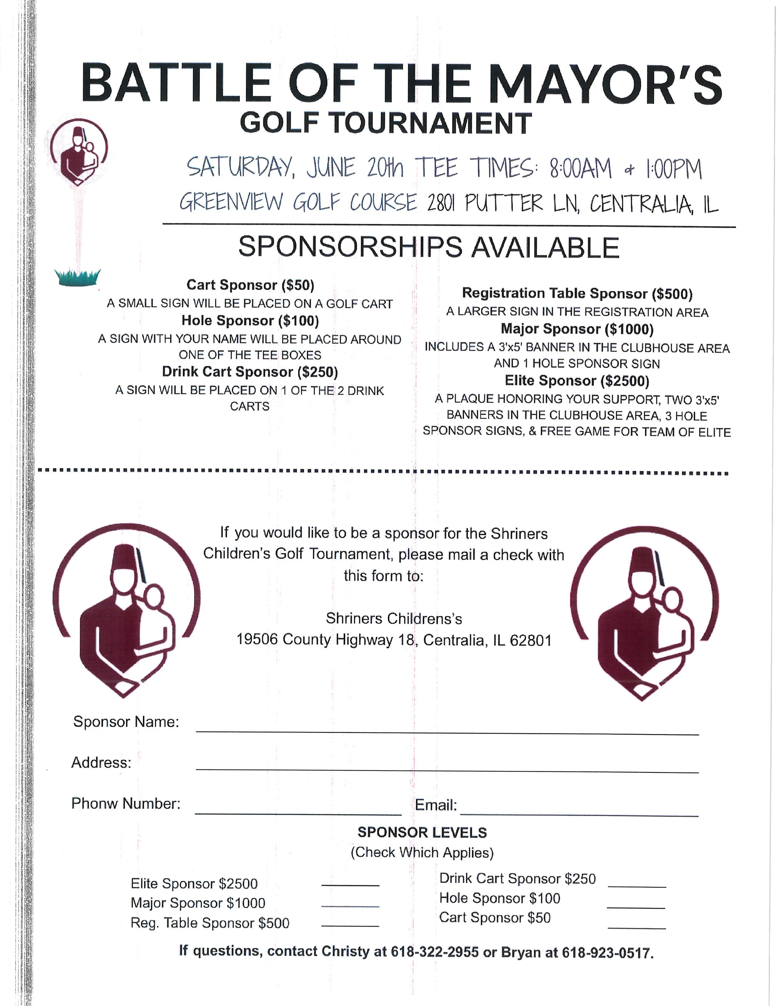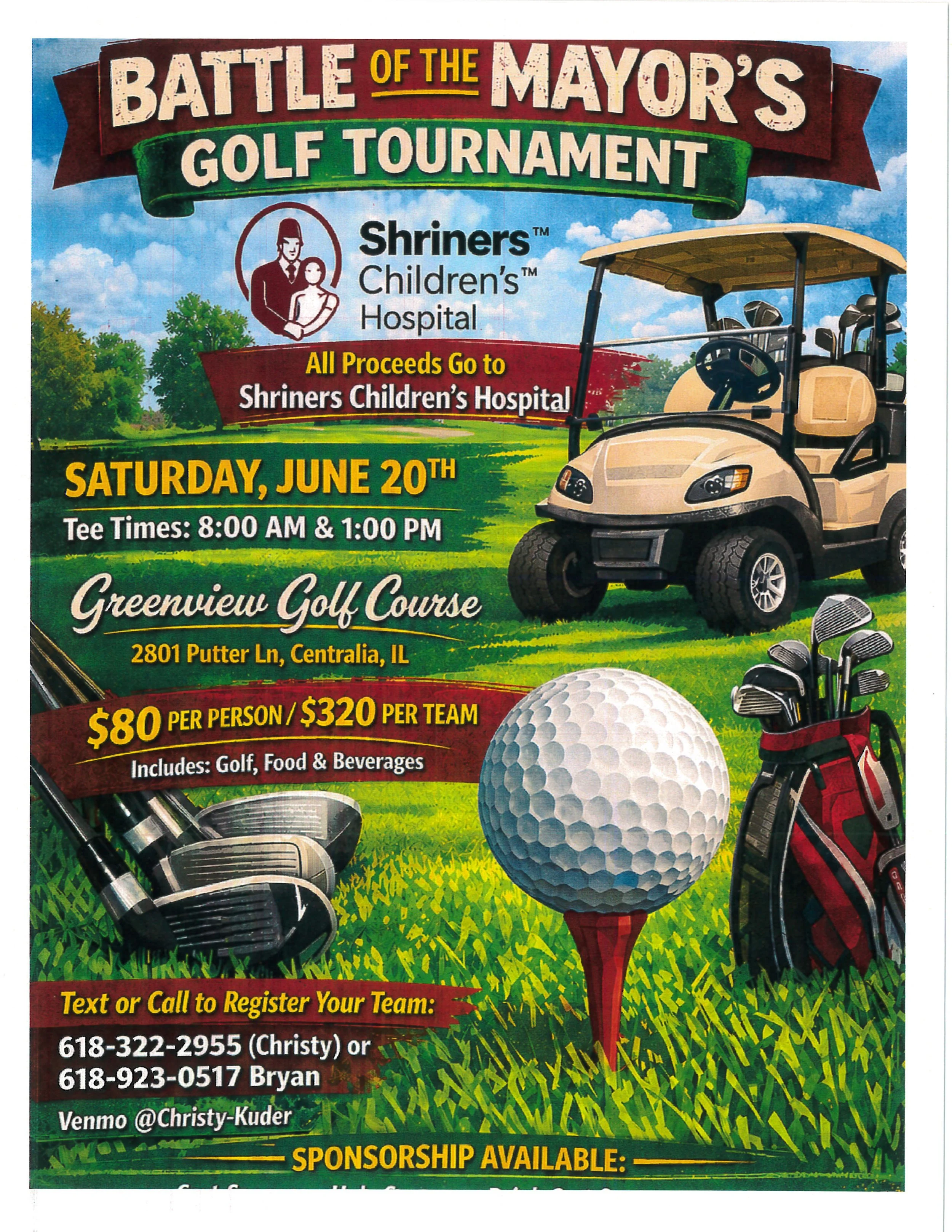 Battle of the Mayor's Golf Tournament for Shriner's Children's Hospital at Greenview Golf Course Saturday, June 20, 2026 8:00 AM 4:00 PM Greenview Golf Course 2801 Putter Drive Centralia, IL, 62801 United States (map) Google Calendar ICS