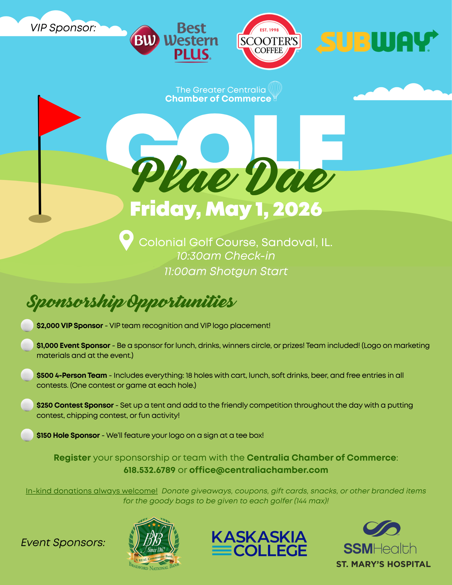 Sponsored by Best Western Plus Hotel & Suites, Scooters Coffee, Subway Restaurants, Bradford National Bank, Kaskaskia College, and SSM Health St. Mary’s Hospital.